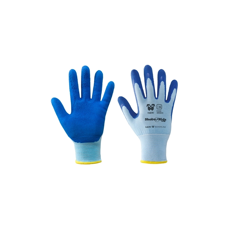 Guanto in filo continuo 100% nylon. Palmo ricoperto da una speciale schiuma di lattice. Misure per bambini. Ottima presa anche a contatto con superfici bagnate ed elevata flessibilita'. Ottima resistenza all'usura. Polso elasticizzato e dorso aerato. Colore azzurro/blu. Modello = taglia