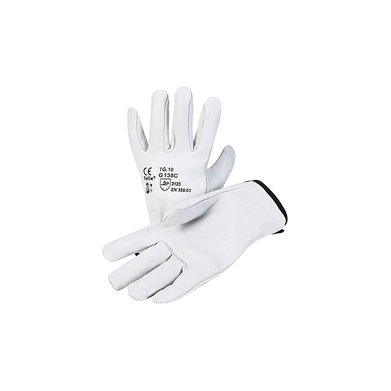 Guanto in pelle fiore bovina di prima qualita'. Cuciture ergonomiche. Taglie ampie. Orlato. Colore bianco. EN388-2123X. Modello = taglia