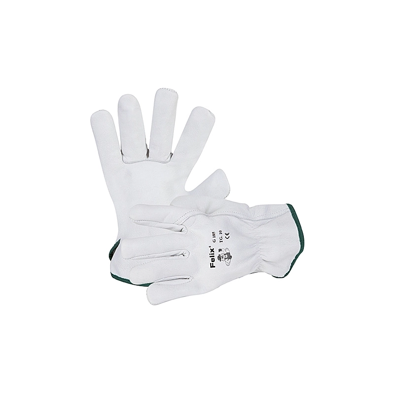 Guanti in pelle fiore bovina, orlati. Interno felpato. Colore bianco. Taglia 10.