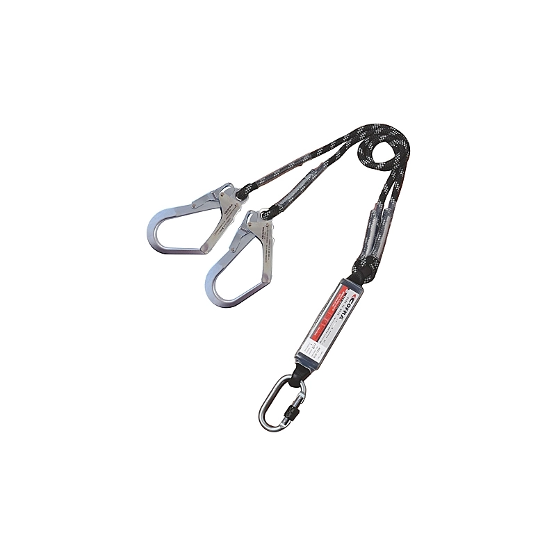 Assorbitore di energia integrato in un cordino comprensivo di 1 connettore di base con ghiera a vite e 2 connettori di ancoraggio a leva rapidi in acciaio. Lunghezza dei cordini 2 mt, diametro 11 mm. EN 355:2002.