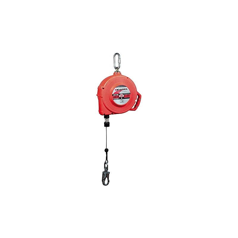 Dispositivo retrattile dotato di un cavo in acciaio zincato di diametro 4,8 mm e di un carter di protezione in nylon rinforzato con fibra di vetro, nel quale e' integrato il sistema frenante. Carter con manico che ne facilita il trasporto ed il montaggio. Sistema doppio SWIVEL antiattorcigliamento del cavo. Resistenza del cavo 15 kN. EN 360:2002, VG CNB/P/11.062. Lunghezza del cavo 10 mt
