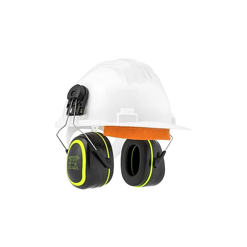 Cuffie antirumore per elmetto EN 352-3:2002 DPI III. Protettori dell'udito con coppe regolabili in ABS e padiglioni sostituibili. Inserti in espanso. Attenuazione 33 db (SNR). Aggancio standard per elmetti da lavoro comuni.