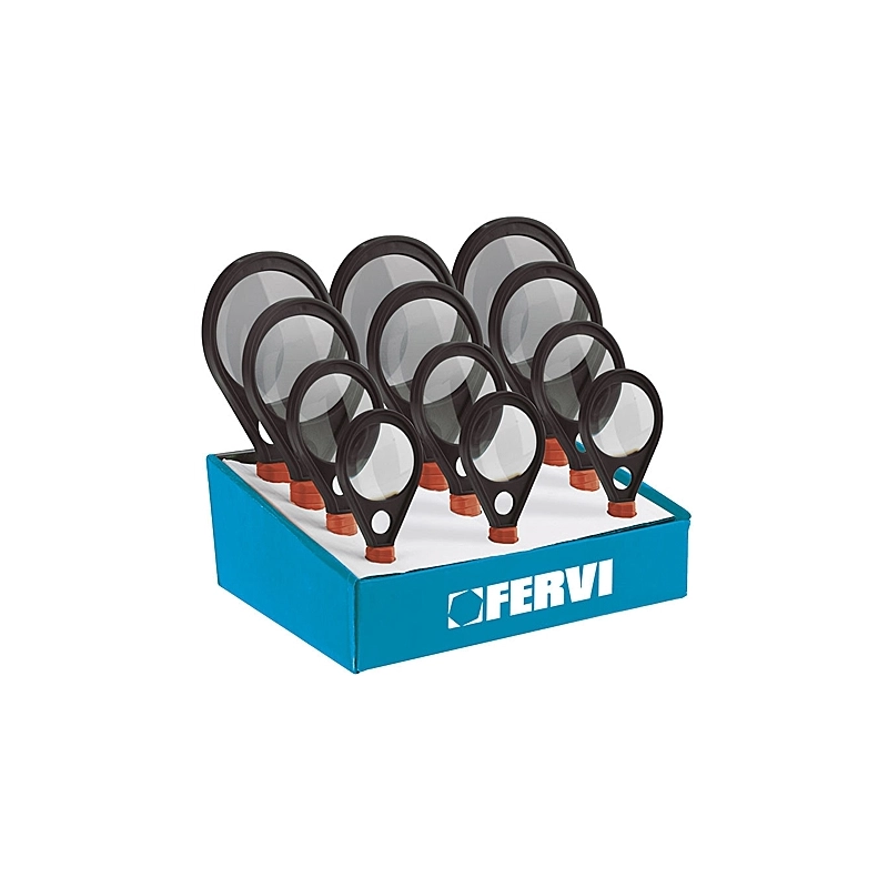 Espositore composto da 12 pz lenti d'ingradimento in cristallo 3X: diametri mm 50, 60, 75 e 90. 3 pz per diametro.