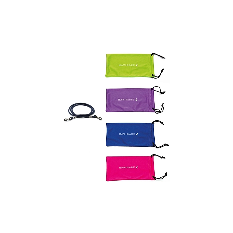 Bustina in microfibra con cordino blu reggi occhiali. Colori assortiti.