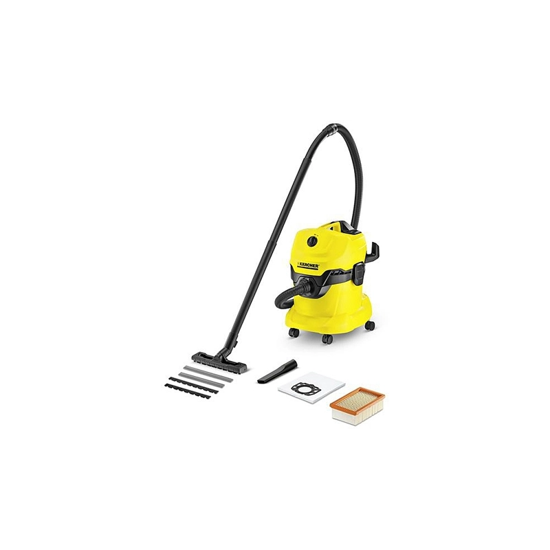 Potenza 1000 W. Capacita' 20 lt. Vano di raccolta in plastica. Cavo elettrico da 5 m. In dotazione: tubo d'aspirazione da 2 m, impugnatura estraibile, tubo rigido aspirazione (2 pezzi), bocchetta secco-liquidi, clips, filtro plisettato piatto, filtro a cartuccia removibile, bocchetta fessure, 1 sacchetto filtro in vello, paracolpi e interruttore ON/OFF. Dimensioni 384x365x526 mm. Peso 7,1 kg.