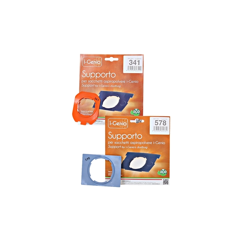 Supporti con fissaggio a scatto per sacchetti iGenio. Colore arancio per scope elettriche, grigio per aspirapolvere a traino. Ricercate il supporto corrispondente al modello di aspirapolvere o scopa sul sito www.i-genio.it. Modello = codice supporto