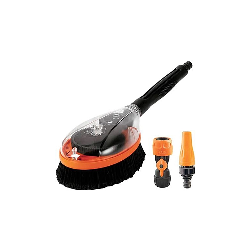 Spazzola ad ingranaggi con dispenser per sapone liquido. Completa di lancia a spruzzo. Raccordo automatico portagomma.