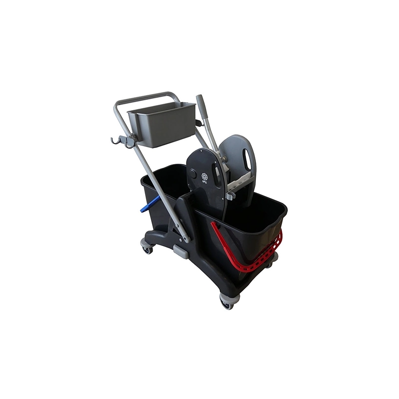 Dotato di secchi da 25 lt e strizzatore. Vaschetta porta oggetti con ganci laterali. Maniglia reversibile verniciata. Dimensioni 810x435x880h mm.