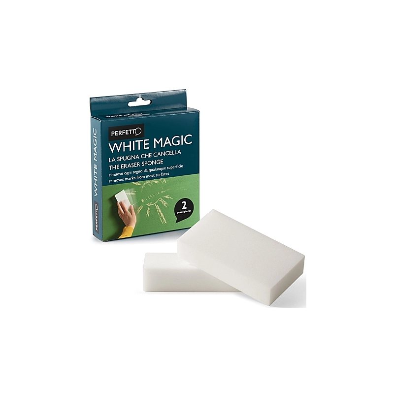 Spugna abrasiva "white-magic" che rimuove ogni segno da qualunque superficie. Dimensioni 12x6x2,5 cm. Confezione da 2 pezzi.