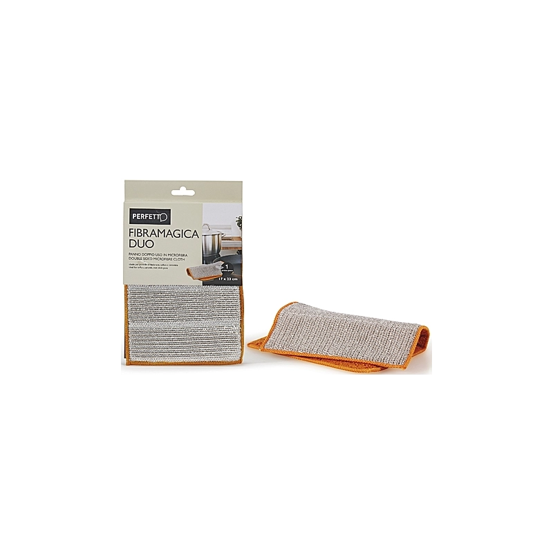 Panno in microfibra accoppiato con abrasivo. Composizione: 80% poliestere, 20%poliammide. Imbottitura 100% poliuretano. Dimensioni 17x23 cm.