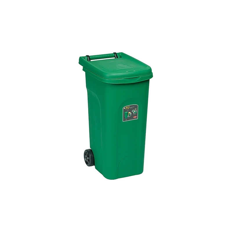 Bidone con ruote ideale per l'utilizzo in esterno. Con fermasacco. Capacita' 80 lt. Per sacco 70x110 cm. Dimensioni 51x40x79,5h cm. Colore verde.