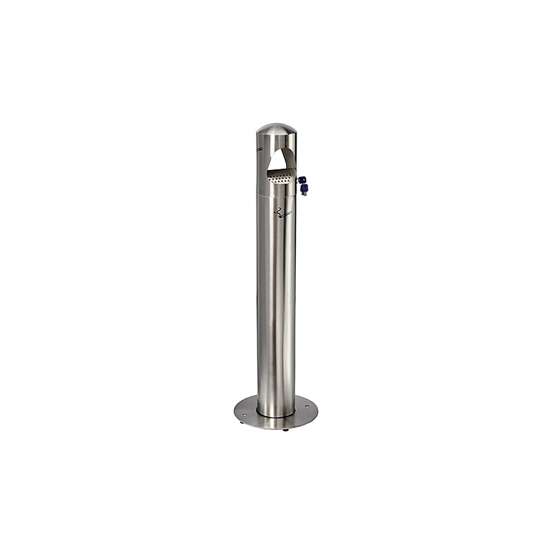 Portacenere inox a colonna. Secchio interno in acciaio inox con maniglia, chiusura a chiave. Piedini d'appoggio in plastica, puo' essere fissato al suolo. Altezza 101 cm. Diametro 13 cm. Diametro base 30 cm.