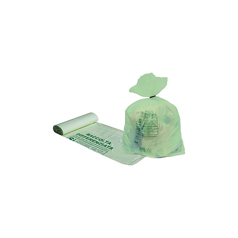 Sacco per umido biodegradabile e compostabile. A norma UNI EN 13432. Saldatura antigoccia. Modello = dimensioni cm/capacita' lt/peso gr/rotoli da pz