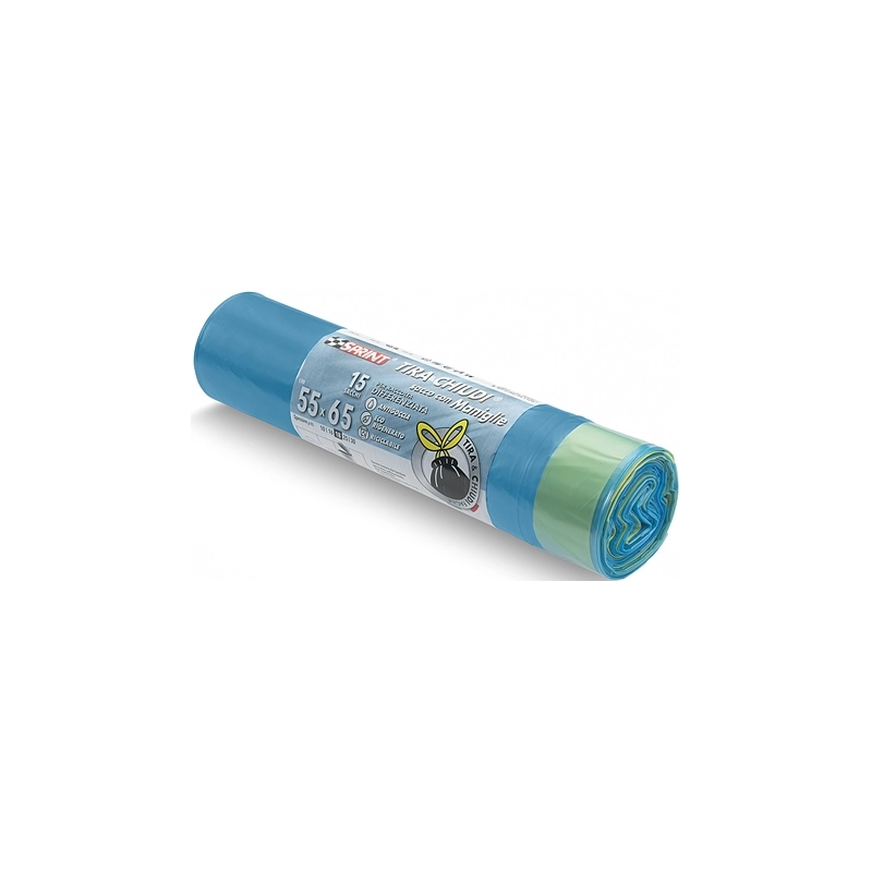 Sacchi in polietilene con maniglie tira e chiudi. Saldatura laterale estesa antigoccia. Rotolo da 15 sacchi. Dimensione 55x65, litri 45. spessore 18 micron. Modello = colore