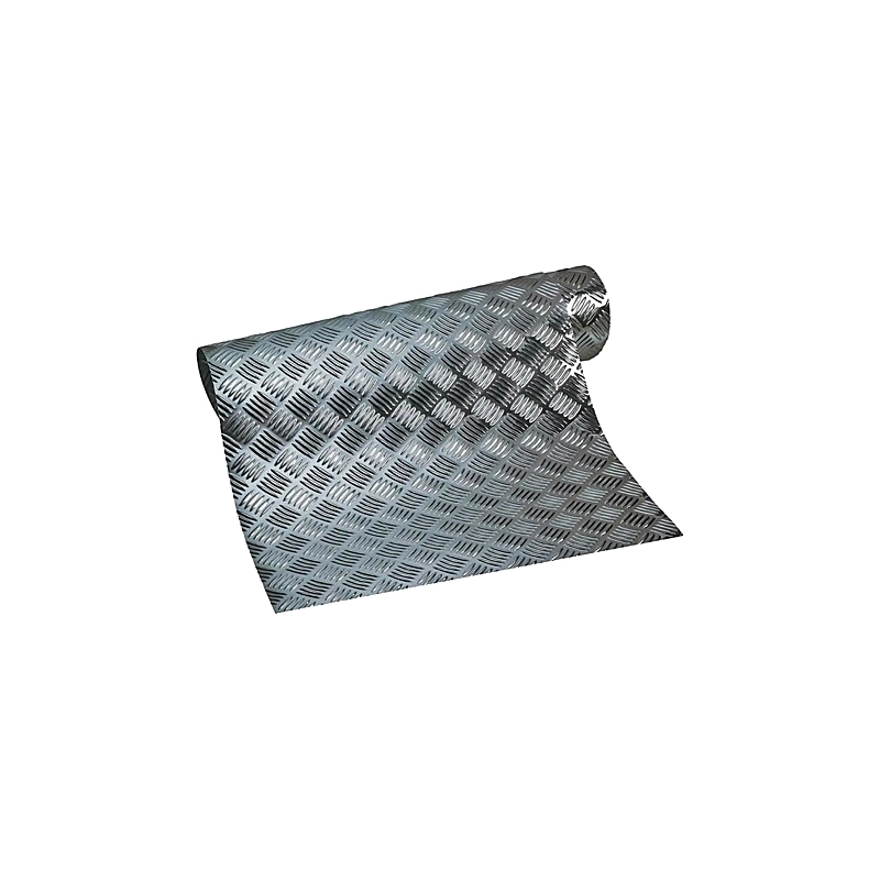 Pavimento in Pvc, spessore mm 1,3. Altezza 1 mt. Rotolo da 25 mt. Effetto lamiera mandorlata, colore argento.