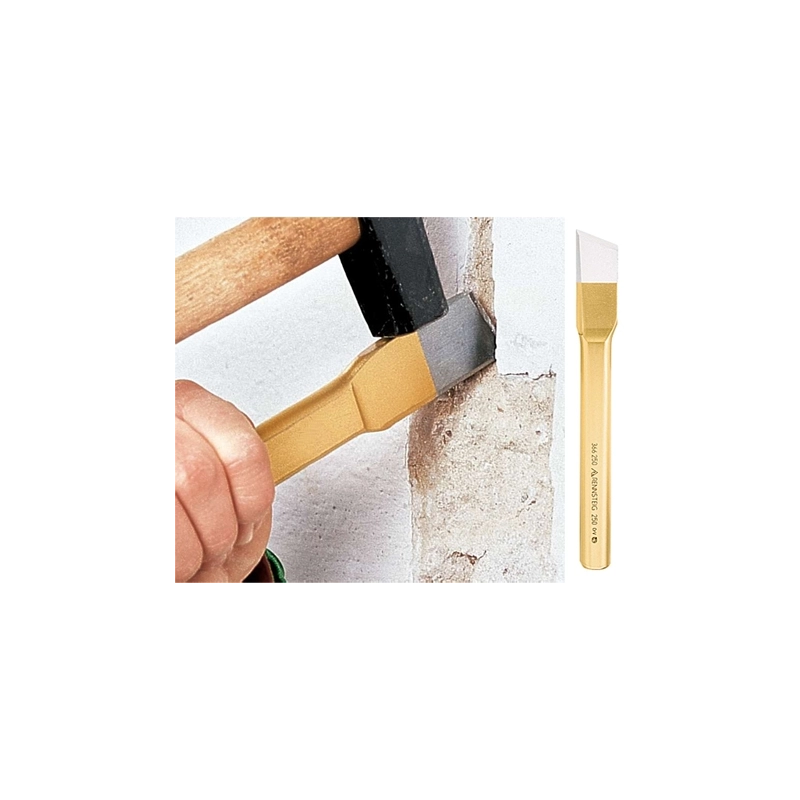 Scalpello in acciaio altolegato per utensili. Consente ripetute riaffilature della punta.Testa con speciale trattamento che evita la scheggiatura e la deformazione del materiale. Verniciato a immersione. Colore oro. Larghezza 33 mm. Lunghezza 250 mm. Impugnatura a sezione ovale da 23x13 mm. Made in Germany.