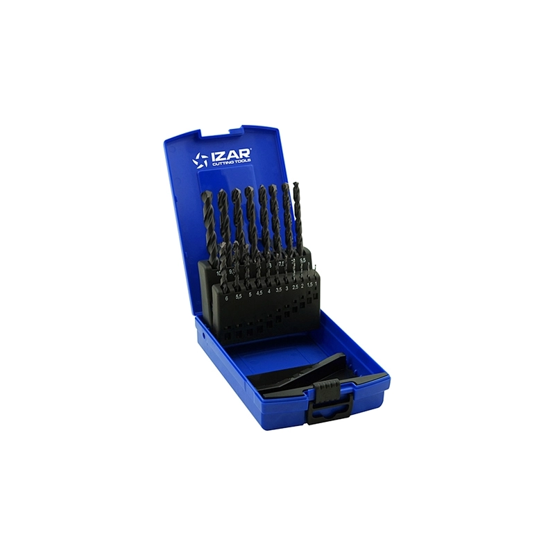 Serie punte in acciaio super rapido - fresate DIN 338N con codolo cilindrico. Cassetta in materiale plastico. Misure con intervallo di 0,5 mm. Modello = n. pezzi/misure min-max mm