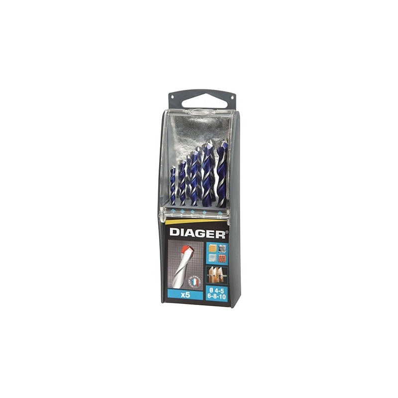 Set 5 punte multimateriale con codolo cilindrico. Indicate per legno, metallo, muratura e ceramica. Non utilizzabili con modalita' percussione. Dimensioni punte: 4x75 mm, 5x85 mm, 6x100 mm, 8x120 mm e 10x120 mm.
