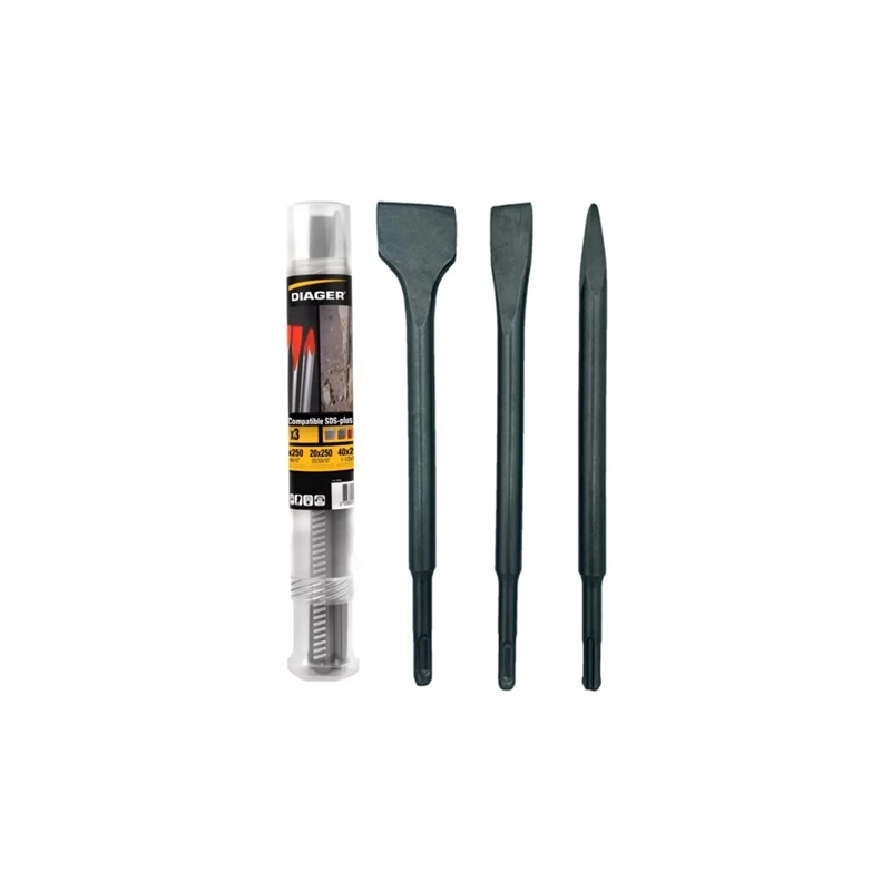 Set 3 scalpelli con attacco SDS Plus. 1 a punta diametro 14 mm x 250 mm, 1 piatto 20x250 mm e 1 piatto largo 40x250 mm.