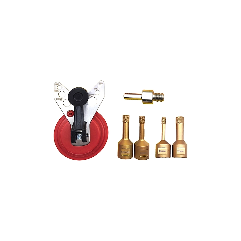 Set composto da: 4 foretti gres misure 6/8/10/12 mm con attacco M14 e adattatore M14/esagonale. Ventosa con guida punte per forare nei punti corretti.