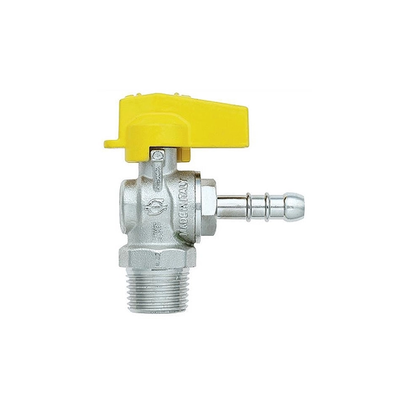 Rubinetto da 1/2' a sfera a squadra Maschio-Portagomma UNI 7141, con levetta in alluminio gialla. Conforme alla norma EN 331. Made in Italy. Modello = tipo gas