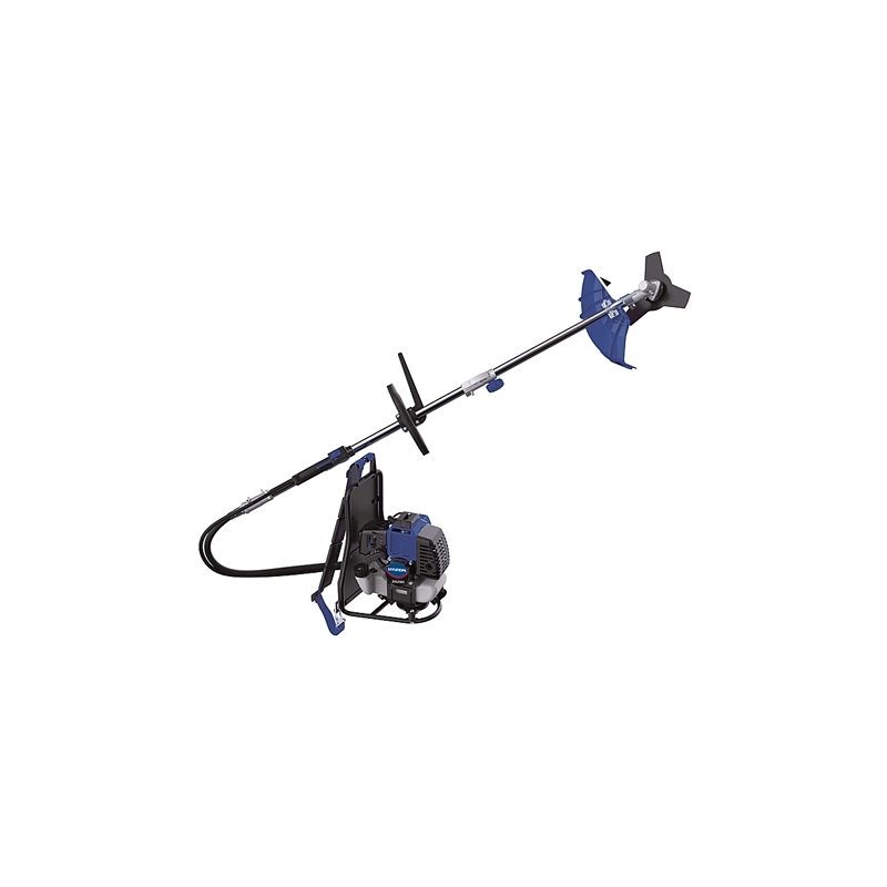 Decespugliatore a zaino, a scoppio da 52 cc. 2,2 Kw / 3,0 HP. Motore Hyundai 2 tempi raffreddato ad aria. Lunghezza albero 1500 mm. Diametro albero 26 mm. Capacita' serbatoio 1,26 lt. Avviamento a strappo. Impugntura grip ergonomica. Carburatore a membrana. Tracolla di sostegno regolabile e imbottita. Schienale comfort. In dotazione testina e lama in metallo.