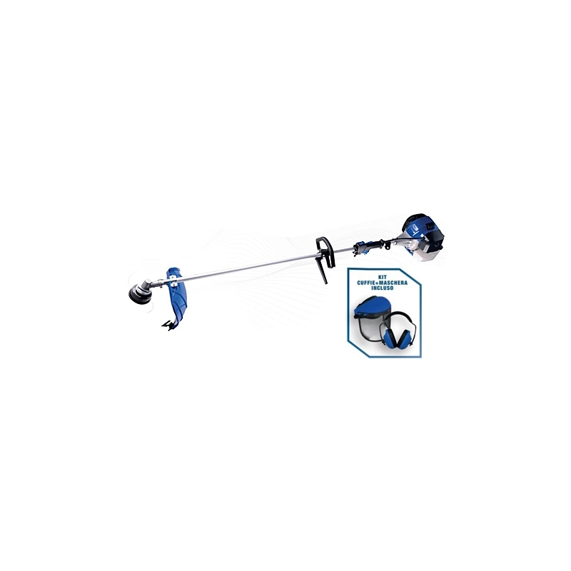 Decespugliatore a 2 tempi. Avviamento Easy start. Cilindrata 43 cm3 - 1,7 HP. Capacita' serbatoio 0,8 lt. Impugnatura comfort. Peso 7,5 kg. Con cuffie e maschera incluse