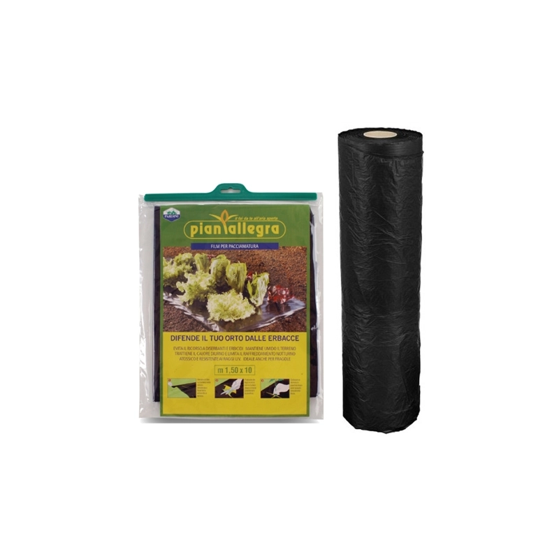 Film per pacciamatura in polietilene. Colore nero. Ideale per proteggere le verdure da erbe infestanti. Spessore 0,05 mm. Modello = altezza mt/lunghezza mt