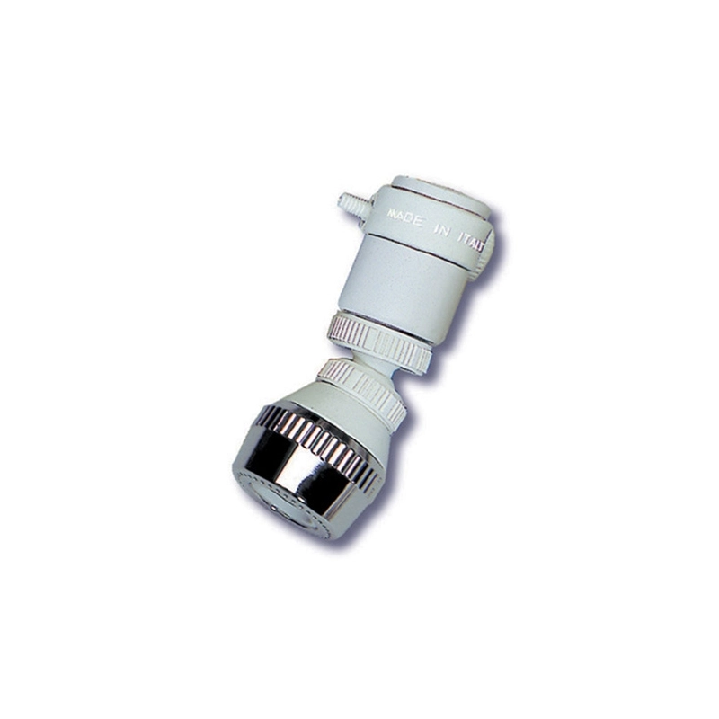 Snodo con fissaggio a fascetta per rubinetti lisci. Con doccetta cromata e aeratore. Dotato di economizzatore acqua. Lunghezza 10 cm.