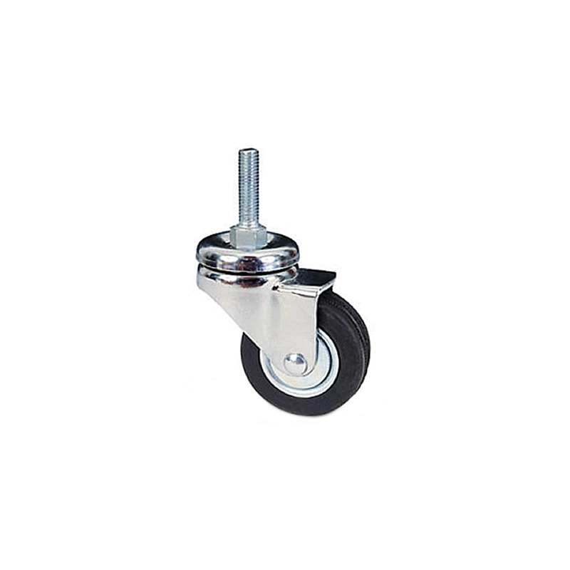 Ruota in gomma grigia con supporto rotante a perno filettato. Lunghezza perno 30 mm. Mozzo a sfera, finitura cromata. Modello = diametro mm/portata kg/filetto