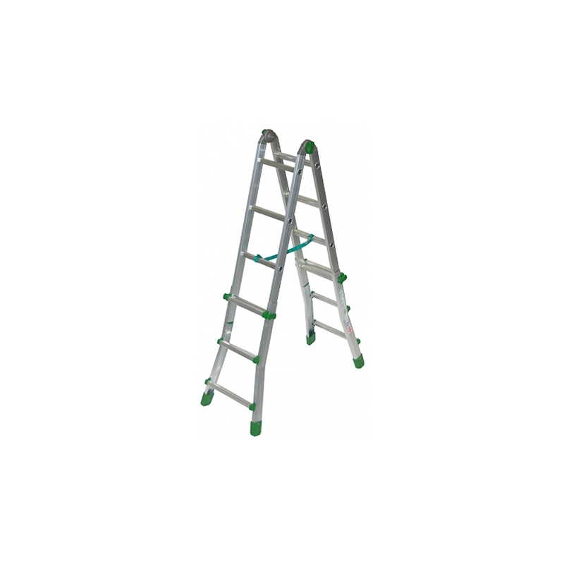 Interamente realizzate in alluminio estruso. Puo' essere trasformata agevolmente in scala a doppia salita, scala d'appoggio, scala a ponte, oppure in 2 comodi cavalletti. D.lgs 81/2008. A norma EN131 con l'aggiunta dell'allargatore da ordinare a parte. Modello = numero gradini/estensione max cm/art.fornitore