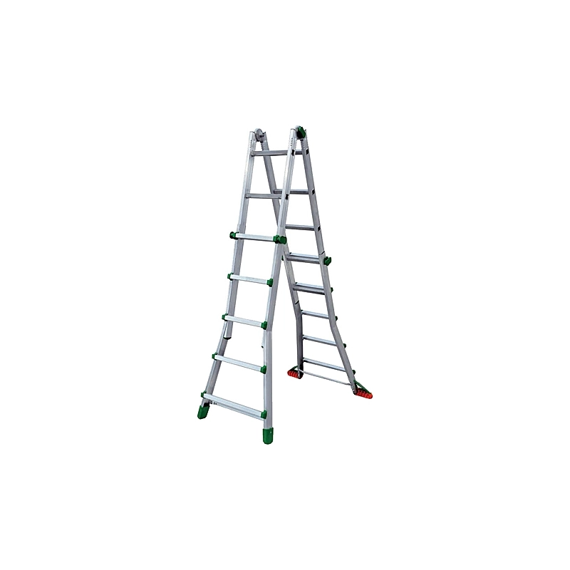 Interamente realizzate in alluminio. Puo' essere trasformata agevolmente in scala a doppia salita, scala d'appoggio, scala a ponte, oppure in 2 comodi cavalletti. D.lgs 81/2008. A norma EN131-4, con allargatori in dotazione. Portata 150 kg. Modello = numero gradini/estensione max cm/art.fornitore