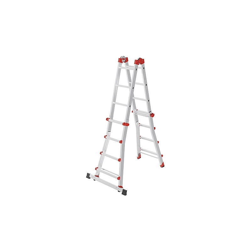 Scala in alluminio brevettata. Sistema di sicurezza apertura-chiusura semi-automatico. Montanti con profilo stondato per una presa piu' confortevole. Piolo esterno 30x30 mm fissato con 3 punti di saldatura ogni lato e copripiolo arrotondato. Piedini bi-componente. Con barra stabilizzatrice sono conformi a norma EN131-4. Modello = n.gradini/estensione max cm