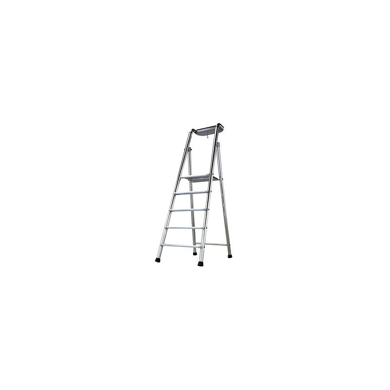 Scala professionale in alluminio a 5 gradini. Stabilita' e sicurezza eccezionali grazie al montante tondo da mm 50 ed alle cerniere indeformabili ed autocompensanti su pavimenti non perfettamente piani. Portata kg 350
