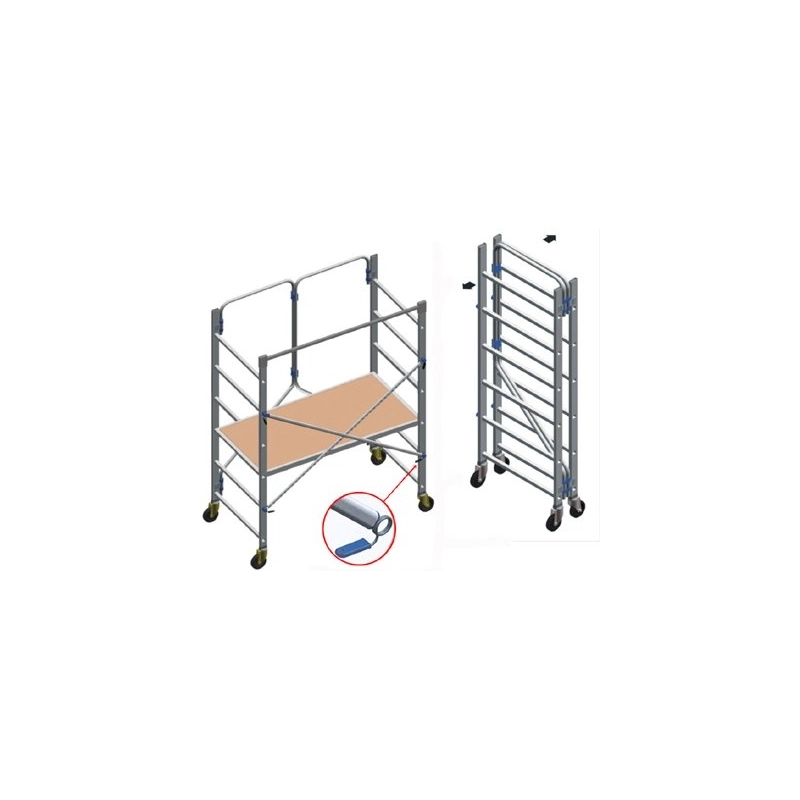 Trabattello in alluminio con giunzioni in nylon brevettate che ne permettono la chiusura a pacchetto. Dimensioni cm.(lxpxh): 150x75x198. Portata max: kg.150. Pianetto in alluminio e legno 68x152cm. Altezza max pianetto cm. 86. Ruote con freno diametro 100mm.