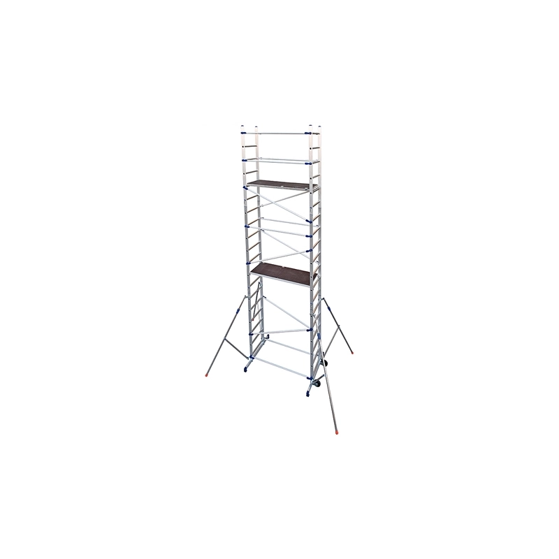 Trabattello in alluminio a due alzate con innesti d'acciaio rivestiti di speciali resine. Collegamenti rapidi con espansori nei fori dei gradini. Completo di 2 stabilizzatori e ruote su un lato. H max piano 2,36 mt. H totale 3,65 mt. Ordinando l'accessorio prolunga CLAC composto da 1 alzata, 1 piano e 4 stabilizzatori, H max piano 4,46 mt, H totale 5,73 mt. Peso 34,40/67,40 kg.