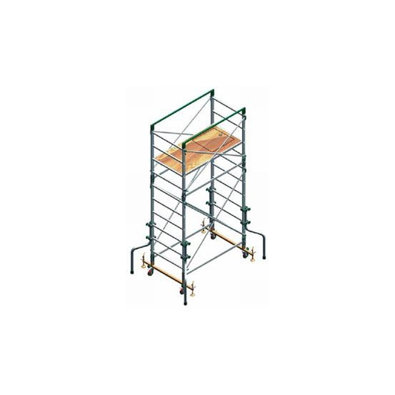 Trabattello professionale in alluminio. Fornito di serie con 4 ruote da mm 125 con freno e livellatori a vite. Sezione delle spalle portanti mm 25x65. Dimensioni cm (lxpxh): 150x75x335. Altezza max pianetto cm 235,con kit prolunga altezza max pianetto cm 415. Portata max kg 150. DPR 164/56