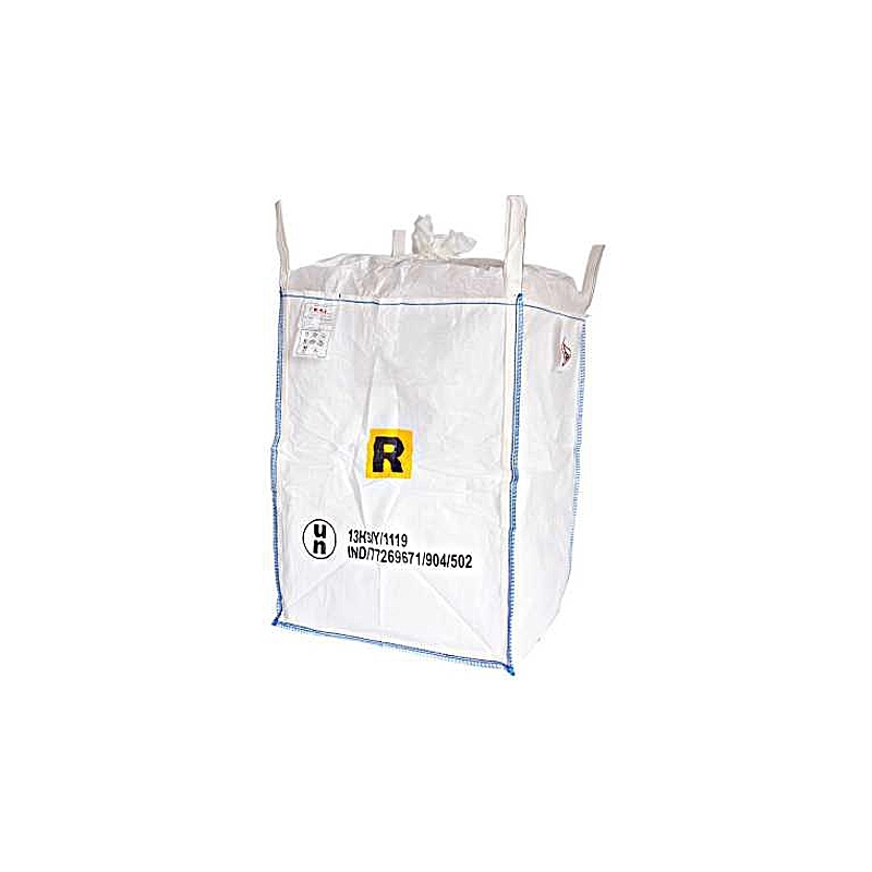 Sacco in polipropilene monouso stabilizzato ai raggi UV. Chiusura sul fondo. Chiusura superiore a caramella. Dotato di 4 cinghie di sollevamento. Dimensioni 90x90x120cm. Portata 1000 kg. Certificato "R" per il contenimento di rifiuti speciali. A norma ONU 13H3Y. All'interno un sacco in plastica LDPE come da regolamento di omologazione.