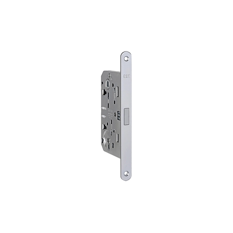 Serratura con scrocco magnetico simmetrico per porte interne. Cromato opaco. Interasse 90 mm. Frontale bordo tondo da 196x18 mm. Entrata da 50 mm. Foro chiave normale. Il montaggio necessita di apposito incontro da ordinare a parte e disponibile anche come ricambio.