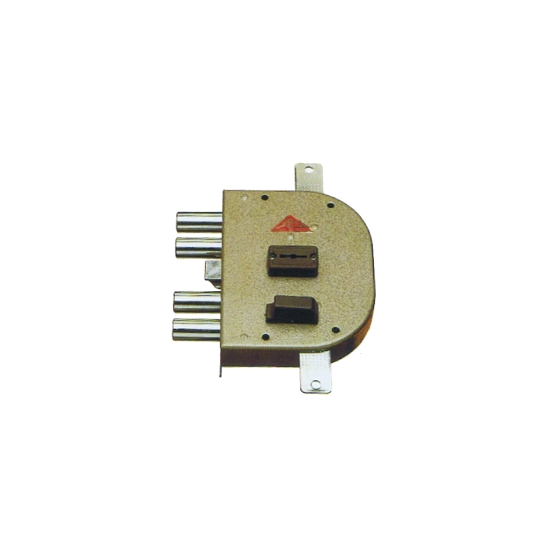 Chiusura triplice con scrocco, a quattro mandate con piastra corazzata e non fornita di aste. Dimensioni scatola mm.130x164. Entrata mm.60. Modello = destra o sinistra