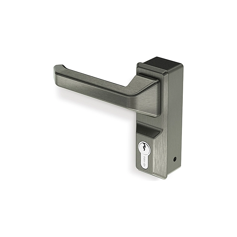 Placca con maniglia ribassata. Adatta per installazioni standard e ad incasso. Reversibile. Disabilitazione maniglia con chiave. Funzione condominio: settaggio chiave non estraibile. Per maniglioni ALPHA.