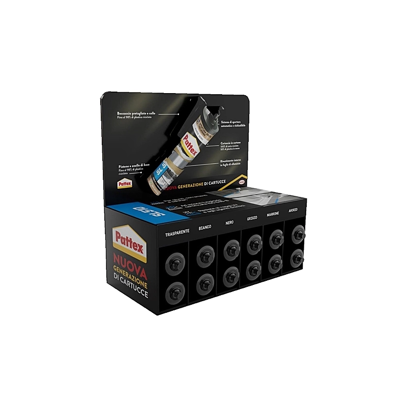 Display composto da 12 Pattex SL510 da 280 ml. 2 colori per tipo tra: grigio, marrone, avorio, nero, bianco e trasparente.