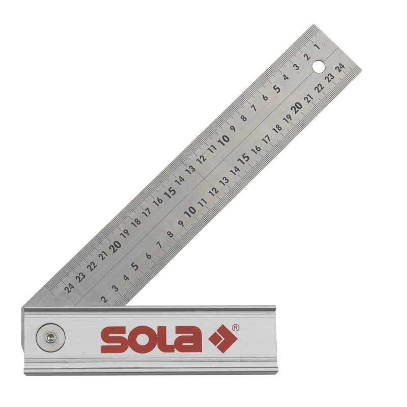 Lama in acciaio armonico inox. Impugnatura in alluminio anodizzato. Blocco a 45 gradi, 90 gradi e 135 gradi. Doppia millimetratura incisa sui 2 lati. Lunghezza mm 300x170