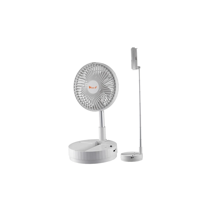 Ventilatore pieghevole ricaricabile con presa USB. Altezza regolabile fino a 80 cm. 3 velocita'. Tempo di ricarica 3 ore. Diametro 18 cm. Dimensioni 200x200x98 mm.