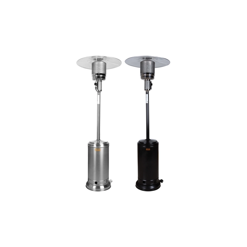 Potenza kw 5-14. Ombrello termico con accensione piezoelettrica. Superficie irraggiata max 25 mq. Dispositivo di sicurezza antiribaltamento. Struttura in acciaio. Bruciatore in acciaio inox. Completo di ruote per la movimentazione. Dimensioni 813x813x2200h mm. Modello = finitura