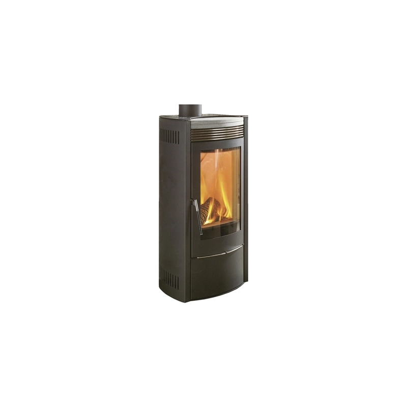 Struttura in acciaio con telaio e vetro porta curvati, focolare in Alutec. Potenza Kw 8. Volume max riscaldabile m3 170. Peso kg.175. Dimensioni cm.112x53x48.