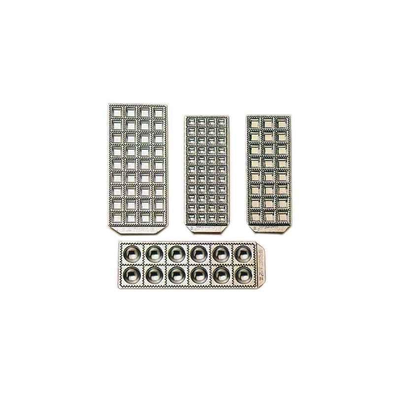 Stampi per la rapida confezione di ravioli. Facili da usare con il mattarello in legno in dotazione. Materiale: alluminio stampato su base in acciaio. Modello = numero ravioli