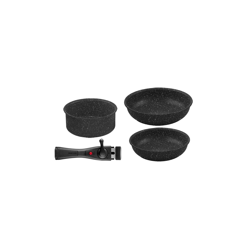 Set composto da 2 padelle serie Bolzano di diametro 24 e 28 cm, 1 casseruola diametro 16 cm e 1 manico removibile.