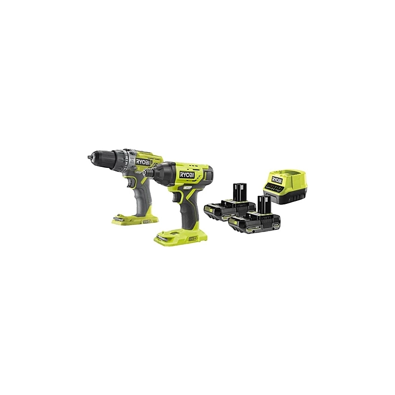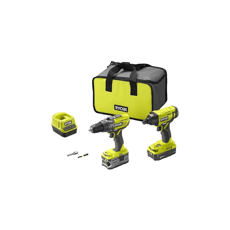 Kit composto da 1 trapano a percussione ed un avvitatore ad impulsi. Trapano a percussione da 18V, ideale per forare legno, metallo o calcestruzzo, 2 velocita' (0-500/1800 giri/min) e 24 regolazioni di frizione. Avvitatore ad impusi da 18V, coppia massima 200 Nm, attacco 1/4' esagonale. Nel kit sono comprese 2 batterie 18V da 2Ah e 1 caricabatterie