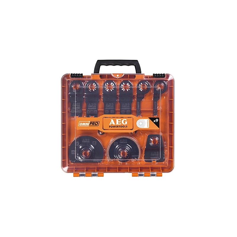 Set accessori 9 pezzi per utensile multifunzione: n.2 lama affondamento Bi-Metallica, n.2 lama affondamento da 28 mm, n.2 lama affondamento 9 mm, n.1 lama taglio a filo, n.1 scrostatore e n.1 lama per rimozioni di vari materiali